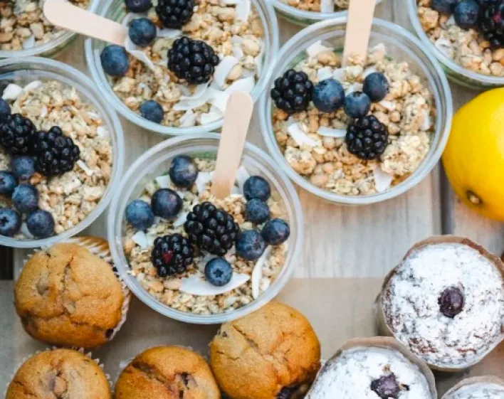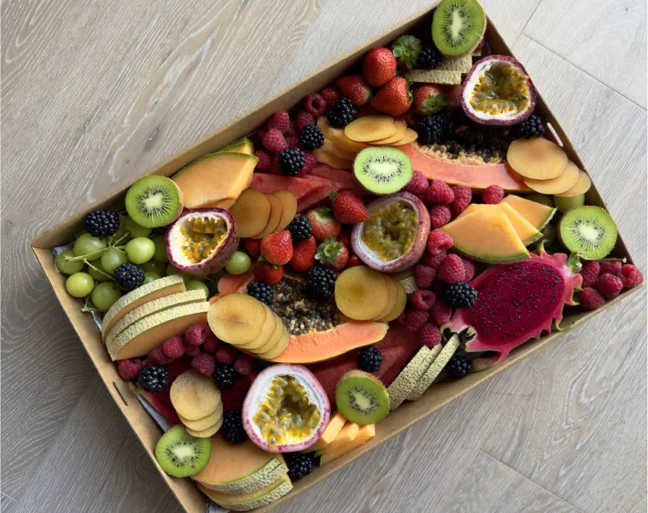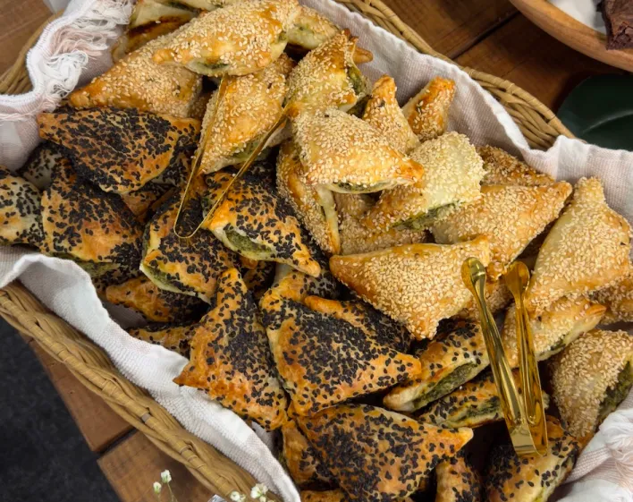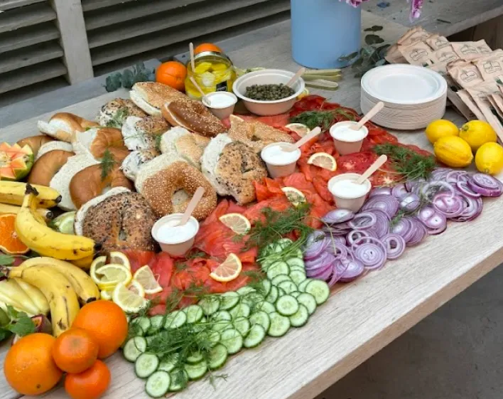 Indulge in a beautifully curated brunch spread featuring a gourmet bagel bar with smoked salmon, creamy egg and tuna salads, and a selection of dips and cream cheese spreads. Accompanied by an assortment of mini quiches, golden spinach and cheese pastries, a fresh pear and parmesan rocket salad drizzled with balsamic glaze, vibrant seasonal fruit, and our signature homemade French vanilla slice.